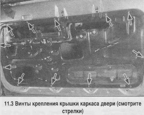 9. Высверлите заклепки из стеклоподъемника и снимите стеклоподъемник с крышки двери. При сборке закрепите стеклоподъемника винтами — саморезами вместо заклепок.