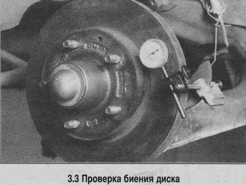 3. Проверьте биение диска по его краю с помощью стрелочного индикатора (смотрите фотографию). Если биение по индикатору превышает норму, то снимите диск и прошлифуйте. На полноприводных моделях заверните 2 гайки колеса на место, чтобы зафиксировать диск относительно ступицы. Плоские поверхности гаек должны быть обращены к диску. Если биение по индикатору превышает норму (0,15 мм), то снимите диск и прошлифуйте.