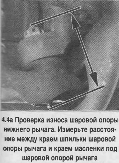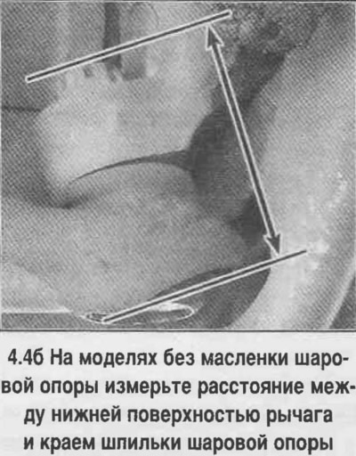 4. Вывесите подвеску домкратом (домкрат должен воспринимать вес подвески). Измерьте расстояние между краем шпильки шаровой опоры рычага и краем масленки под шаровой опорой рычага (А). Если масленка отсутствует, то измерьте расстояние между нижней поверхностью рычага и верхней частью шаровой опоры рычага (В) (смотрите фотографию).