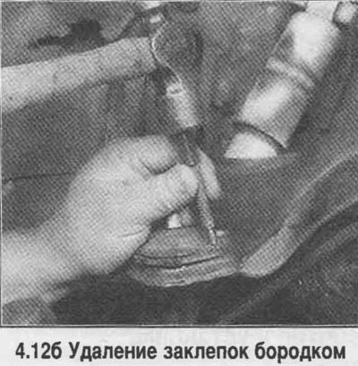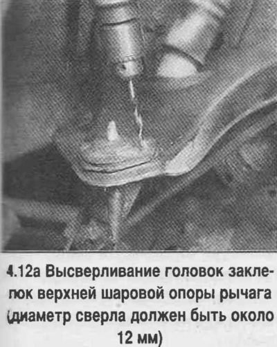 12. Чтобы снять верхнюю шаровую опору с рычага, высверлите заклепки (смотрите фотографию). Снимите шаровую опору и очистите рычаг. Установите новую верхнюю шаровую опору по месту и закрепите гайками и болтами из комплекта (смотрите фотографию).
