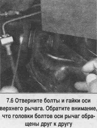 6. Если автомобиль был модернизирован с помощью специального приспособления, то обозначьте метками положение регулировочных кулачков на раме, чтобы их можно было установить в первоначальное положение, не нарушая регулировки. Отверните болты и гайки оси верхнего рычага (смотрите фотографию). Снимите верхний рычаг.
