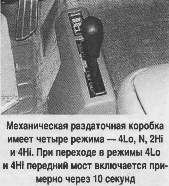 Раздаточные коробки бывают трех видов: ручная, Insta Тгас и последний писк моды Р электронная Auto Тгас. Механическая раздаточная коробка, которая с самого начала выпуска полноприводных модификаций устанавливалась на все автомобили, имела четыре рабочих режима: 2Hi Р привод на задние колеса; 4 Hi Р полный привод; 4 Lo — полный привод с включением понижающей передачи и N — «нейтраль». Сменившая ее Insta Trac имеет те же режимы. Правда, ручку переключения режимов, в механической раздаточной коробке располагавшуюся на полу, заменили переключателями на панели приборов. В 1997 году появилась коробка Auto Тгас. В дополнение ко всем перечисленным режимам она имеет режим ожидания. При включенном режиме 4WD полный привод включается лишь тогда, когда это необходимо.