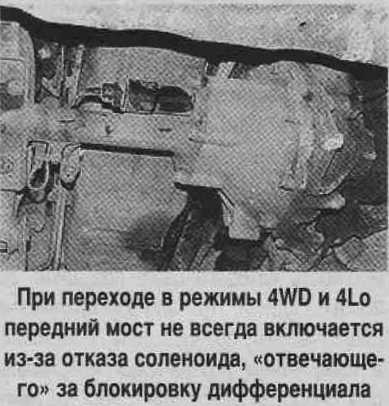 С задним все просто — либо его нет, либо он самоблокирующийся и включается по собственному усмотрению. Передний дифференциал (естественно, при наличии переднего ведущего моста) есть всегда и включается принудительно. Когда вы хотите перейти в режим 4WD или 4Lo, прежде всего посредством соленоида термического типа, который установлен в переднем мосту (и часто выходит из строя), блокируется дифференциал. Лишь после этого передний мост становится ведущим,
