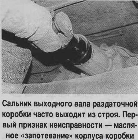 Сальник заднего хвостовика раздаточной коробки часто подтекает. Первый признак его выхода из строя — масляное «запотевание» корпуса хвостовика. При замене сальника замените бронзовую втулку, выполняющую функцию поддерживающего подшипника выходного вала раздаточной коробки.