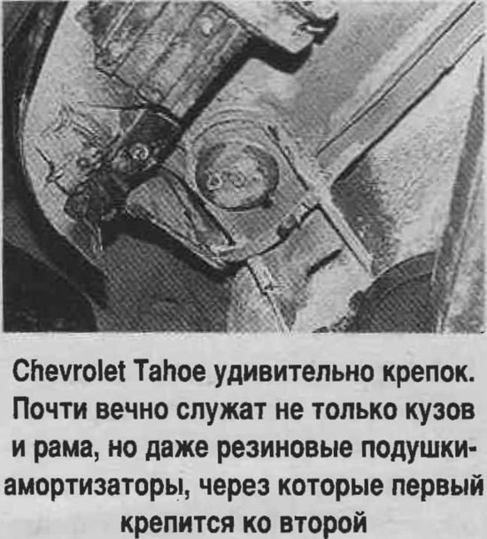 Снизу все просто и исключительно надежно: рама, сзади — рессоры (которые, правда, некоторые лихие ездоки умудряются ломать), спереди — двухрычажная торсионная подвеска, выносливость которой вызывает жгучую зависть конкурентов. Согласитесь, это очень напоминает устройство грузовика. Машина исключительно мягкая и плавная на ходу. Как и у многих американских внедорожников, у нее наблюдается легкое поперечное раскачивание кузова. Правда, большого дискомфорта ни водитель, ни пассажиры при этом не испытывают. Если вы не забываете регулярно обслуживать ваш автомобиль, проблем с ним не возникает. Единственное относительно слабое место — рулевое управление. Маятниковый рычаг, сошка и наконечники тяг периодически требуют замены. Все остальные неприятности могут быть связаны только с особо агрессивной манерой езды и наездами на препятствия — бордюры, колодцы и т.п. Если же вы не будете измываться над Tahoe почем зря, то на ней безболезненно смогут гонять «с ветерком» и ваши внуки.
