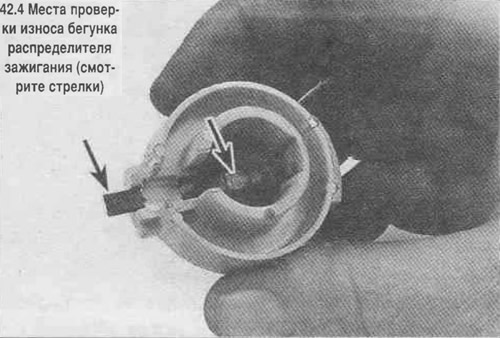 4. Проверьте состояние бегунка на валике распределителя зажигания. Убедитесь в отсутствии трещин, следов поверхностного пробоя,износа, подгорания и коррозии (смотрите фотографию). При обнаружении этих дефектов, а также при ослаблении пружинного контакта бегунок замените.