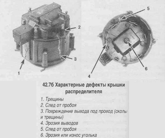 7. Протрите крышку начисто и проверьте наличие внутри и снаружи крышки трещин, следов поверхностного пробоя (тонких обуглившихся дорожек), износа, подгорания и ослабления контактов (смотрите фотографию).