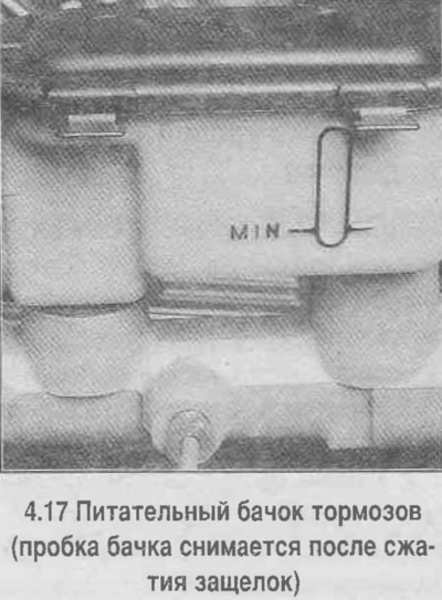 21. Имейте в виду, что уровень жидкости в бачках может постепенно понижаться в течение длительного времени вследствие естественного износа тормозных колодок. Быстрое понижение уровня жидкости в питательном бачке указывает на течь в системе гидропривода и на необходимость немедленного ее устранения.