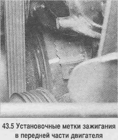 9. Прогрейте двигатель, переведите на холостой ход. Направьте свет стробоскопа на шкалу. Метка на шкиве коленвала должна находиться напротив соответствующего деления шкалы. При необходимости ослабьте болт крепления распределителя и, медленно поворачивая распределитель, установите момент зажигания (смотрите «Технические данные»). Затяните болт распределителя и снова проверьте установку момента зажигания. Доступ к болту крепления затруднен, поэтому для отворачивания этого болта используется специальный ключ.