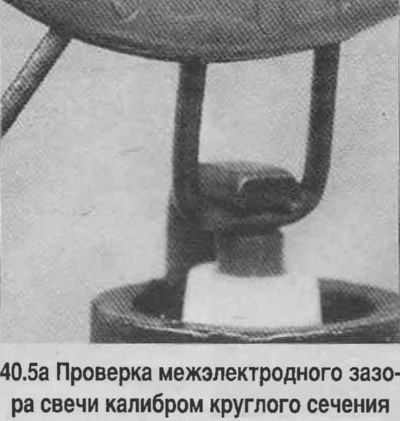 5. Проверьте зазор между электродами новых свечей калибром круглого сечения (смотрите фотографию). Зазор между электродами должен соответствовать указанному в разделе «Технические данные», или в подкапотной табличке. Щуп должен перемещаться в зазоре между электродами под небольшим усилием. Если зазор не соответствует норме, то подогните электрод с помощью рычага на корпусе набора калибров (смотрите фотографию).