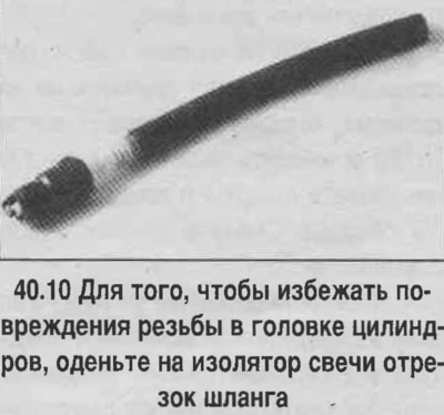10. Чтобы завернуть свечу без перекосов, оденьте на наконечник свечи отрезок шланга с внутренним диаметром 45 мм (смотрите фотографию). Как только свеча начнет заворачиваться с перекосом шланг начнет прокручиваться на изоляторе, вследствие чего предотвращается повреждение резьбы. Затяните свечу с заданным моментом.