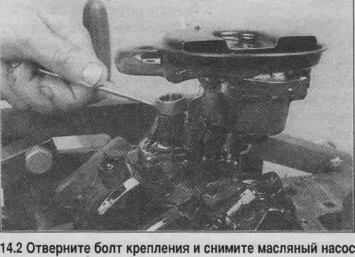 2. Поддерживая масляный насос, отверните болт крепления насоса к задней крышке коренного подшипника (смотрите фотографию).