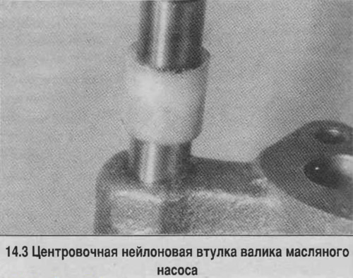 3. Достаньте насос вместе с валиком привода, На большинстве моделей предусмотрена нейлоновая втулка для центровки валика привода и ведущего валика масляного насоса. Эта втулка должна быть на валике привода насоса (смотрите фотографию). В противном случае втулка может быть раздроблена и ее осколки следует удалить из поддона. При сборке втулку замените.
