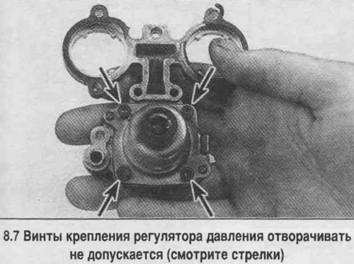 Внимание! Запрещается отворачивать 4 винта крепления регулятора давления к крышке (смотрите фотографию), во избежание повреждения диафрагмы под действием освобождающейся пружины регулятора.