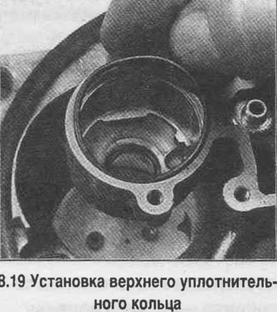 19. Смажьте новое верхнее уплотнительное кольцо жидкостью для автоматической трансмиссии и установите его на стальную шайбу (смотрите фотографию).