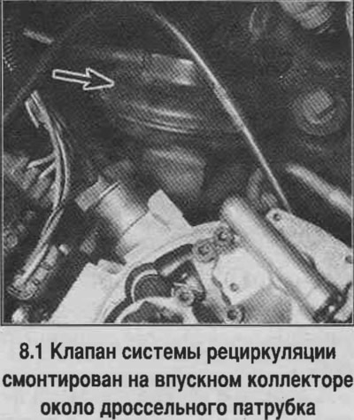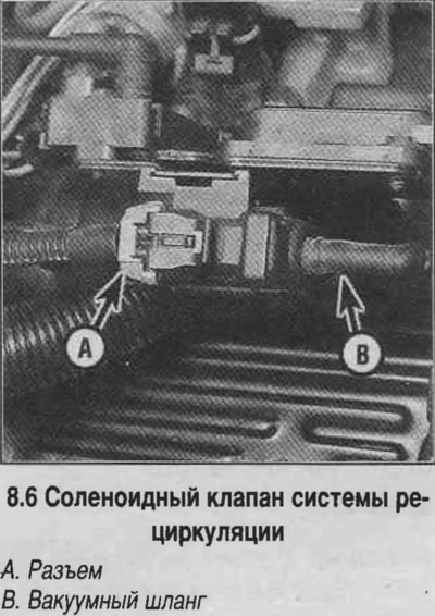 1. В состав системы рециркуляции входят клапан рециркуляции (смотрите фотографию), соленоидный клапан и процессорный блок ЕСМ.