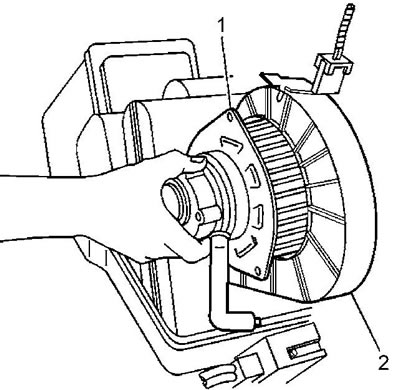 5. Снимите электродвигатель дополнительного вентилятора (1) с блока климатической установки (2).