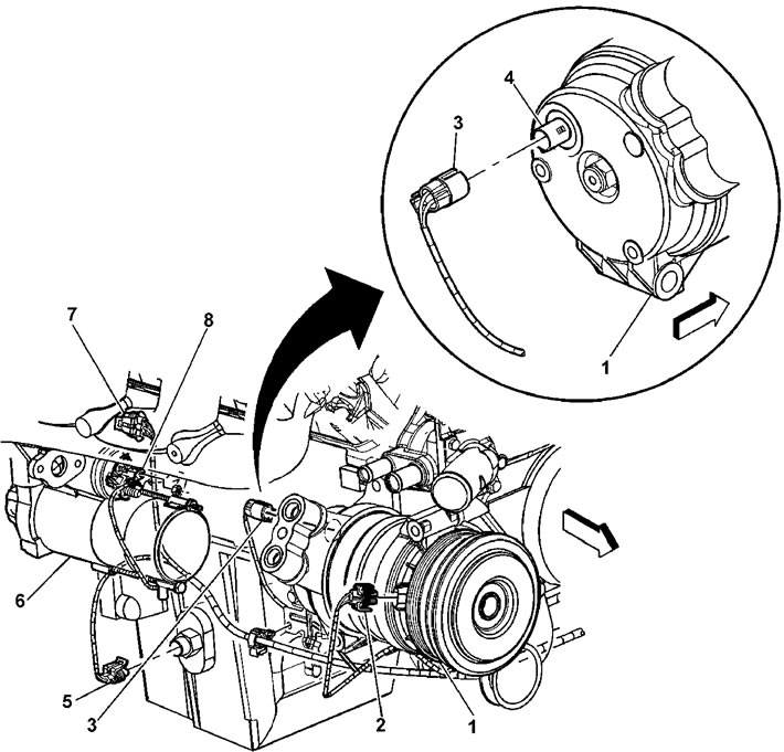 Компрессор кондиционера (модели с механическим управлением). 1 - компрессор кондиционера, 2 - разъем компрессора кондиционера, 3 - разъем выключателя по давлению, 4 - выключатель по давлению, 5 - датчик уровня моторного масла, 6 - стартер, 7 - датчик положения коленчатого вала, 8 - разъем стартера.