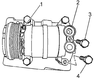 9. Отверните болты (4) крепления компрессора кондиционера. Момент затяжки 50 Н·м.