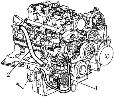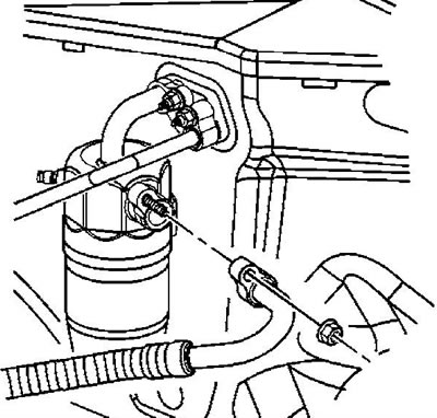 2. Отверните болт крепления шланга подвода хладагента к компрессору кондиционера. Момент затяжки 16 Н·м.