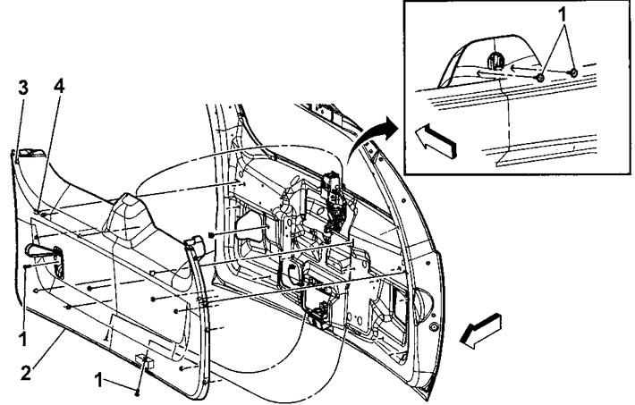 3. Потяните панель (2) наружу до отсоединения панели из пяти клипс (3) и 12 фиксаторов (4).