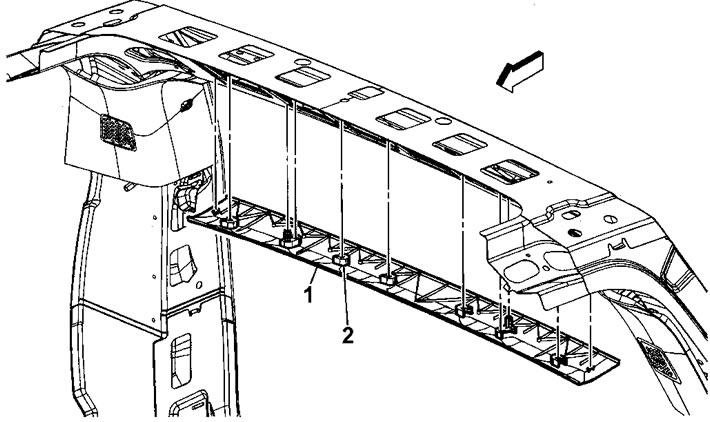 1. Вытяните молдинг (1) из семи клипс (2) крепления молдинга движением вниз.