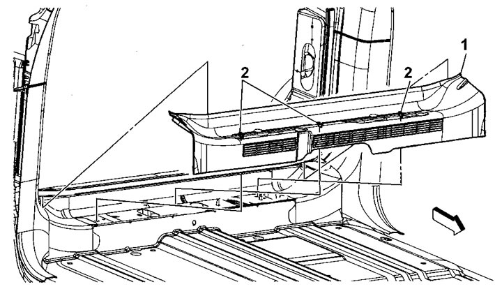 3. Вытяните накладную панель (1) задней части пола из трех фиксаторов (2).