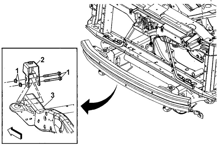 3. Снимите пору усилителя (2) с лонжерона рамы (3).