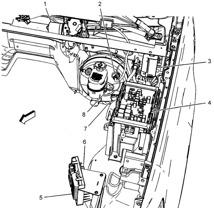 GMT900. Левая сторона моторного отсека. 1 - электродвигатель стеклоочистителя, 2 - вакуумный усилитель тормозов, 3 - нагреватель жидкости омывателя ветрового стекла, 4 - блок предохранителей под капотом, 5 - блок управления двигателем (ЕСМ), 6 - блок управления АКПП (ТСМ), 7 - датчик разрежения в усилителе тормозов, 8 - датчик уровня тормозной жидкости.