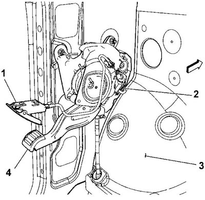 GMT900. Узел стояночного тормоза. 1 - отпускание стояночного тормоза, 2 - выключатель стояночного тормоза, 3 - отделочная панель, 4 - педаль стояночного тормоза.