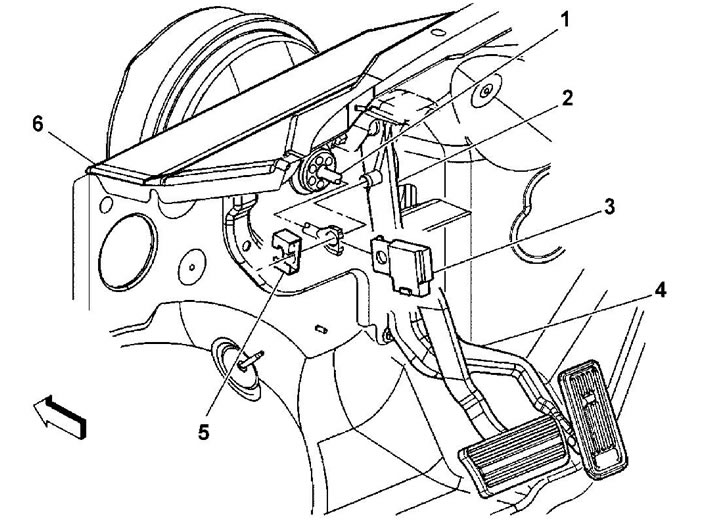 GMT800. Модели с вакуумным усилителем тормозов. Компоненты педали тормоза. 1 - шток вакуумного усилителя тормозов, 2 - педаль тормоза, 3 - выключатель стоп-сигналов, 4 - педаль акселератора, 5 - держатель выключателя стоп-сигналов, 6 - панель комбинации приборов.