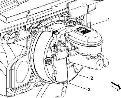 GMT800. Дополнительный насос вакуумного усилителя. 1 - разъем, 2 - вакуумный усилитель тормозов, 3 - дополнительный насос вакуумного усилителя.