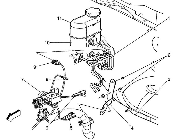 GMT800. Левая сторона моторного отсека. 1 - гидравлические трубки, 2 - штифты, 3 - панель кузова 4 - кронштейн, 5, 6, 8 - разъем, 7 - монтажный блок, 9 - разъем датчика уровня тормозной жидкости, 10 - датчик уровня тормозной жидкости, 11 - бачок.