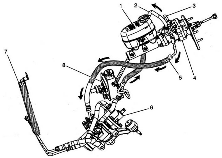 GMT900. Гидравлический усилитель тормозов. 1 - бачок тормозной системы, 2 - возвратный шланг, 3 - входная трубка (от насоса усилителя рулевого управления), 4 - гидравлический усилитель тормозов, 5 - нагнетательная трубка/шланг рулевого механизма 6 - рулевой механизм, 7 - охладитель рабочей жидкости усилителя рулевого управления, 8 - насос усилителя рулевого управления.