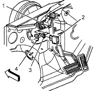 8. Удалите клипсу (4) фиксации толкателя (1) педали тормоза.