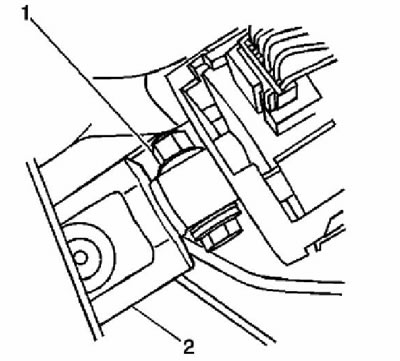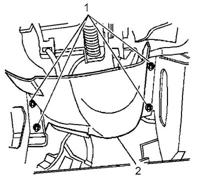 9. Отверните гайки (1) дефлектора коленного упора. Момент затяжки 9 Н·м.