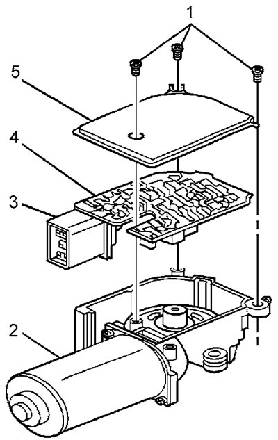 4. Отверните три винта (1) и снимите крышку (5) с электродвигателя (2).