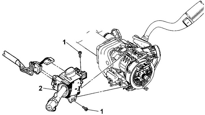 4. Снимите переключатель управления стеклоочистителями и стеклоомывателями с переключателем указателей поворота в сборе (2).