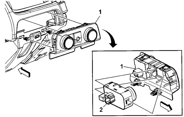 2. Отсоедините фиксаторы и снимите переключатель управления освещением, реостат подсветки и выключатель лампы освещения салона в сборе (2).