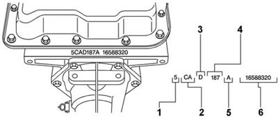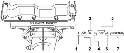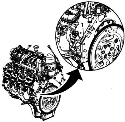 Идентификационный номер двигателя (VIN) расположен на левой задней стороне блока цилиндров (1) и обычно состоит из девяти цифр.