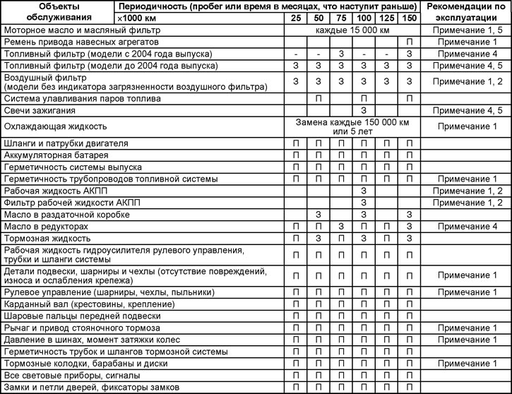 Примечание: П - проверка и/или регулировка (ремонт или замена при необходимости); 3 - замена; С - смазка; М3 - затяжка до регламентированного момента.