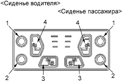 Выбор режима вентиляции осуществляется нажатием выключателя (2), режима обогрева - выключателем (1). Изменение интенсивности нагрева или вентиляции сиденья осуществляется краткими нажатиями на переключатель (3), при этом интенсивность меняется в следующей последовательности: "LOW" → "ME" → "HI" → "OFF". При обогреве или вентиляции сиденья на панели переключателя горит индикатор, соответствующий текущей интенсивности нагрева/охлаждения: при режиме "LOW" горит одна индикаторная лампа, при режиме "HI" горят три индикаторные лампы.