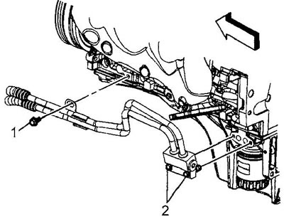 - б) Отверните болты (2) адаптера шлангов охладителя масла. Момент затяжки 12 Н·м.