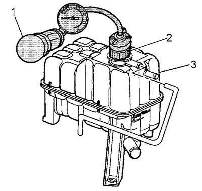 1 - тестер системы охлаждения, 2 - переходник крышки радиатора, 3 - штуцер шланга расширительного бачка