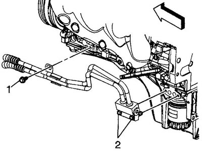- б) отверните болты (2) крепления адаптера шлангов охладителя масла. Момент затяжки 12 Н·м.
