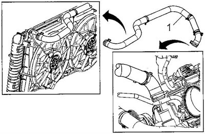 1. Освободите шланг вентиляции радиатора из клипс верхнего шланга радиатора.