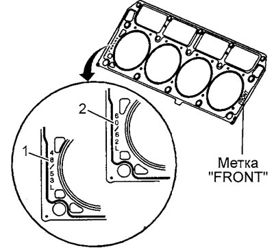 - Головка левого полублока: при правильной установке прокладки метка FRONT должна быть слева и выступ снизу прокладки должен быть слева от центра.