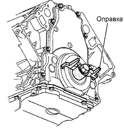 15. От руки затяните центральный болт коленчатого вала для крепления оправки. Затяните болты крепления передней крышки к поддону, затем к блоку. Момент затяжки 25 Нм.