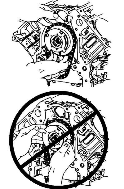 3. Установите муфту привода вместе с цепью на носок распределительного вала по установочному штифту. При необходимости совмещения меток на звездочках распределительного и коленчатого вала немного доверните один или оба вала в нужном направлении. Протолкните привод на вал за звездочку, никогда не толкайте муфту привода за синхронизирующее кольцо.