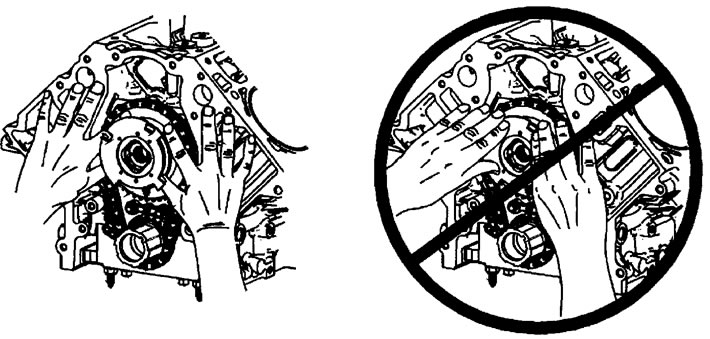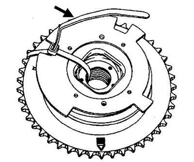 Предостережение: при снятии и установке муфты привода не прикладывайте осевых усилий к синхронизирующему кольцу датчика положения распределительного вала. Синхронизирующее кольцо крепится на муфте приводе системы изменения фаз газораспределения тремя пальцами, поэтому приложение осевых усилий может привести к смещению кольца и раскрутке кольца возвратной пружиной привода с последующим нанесением травмы.